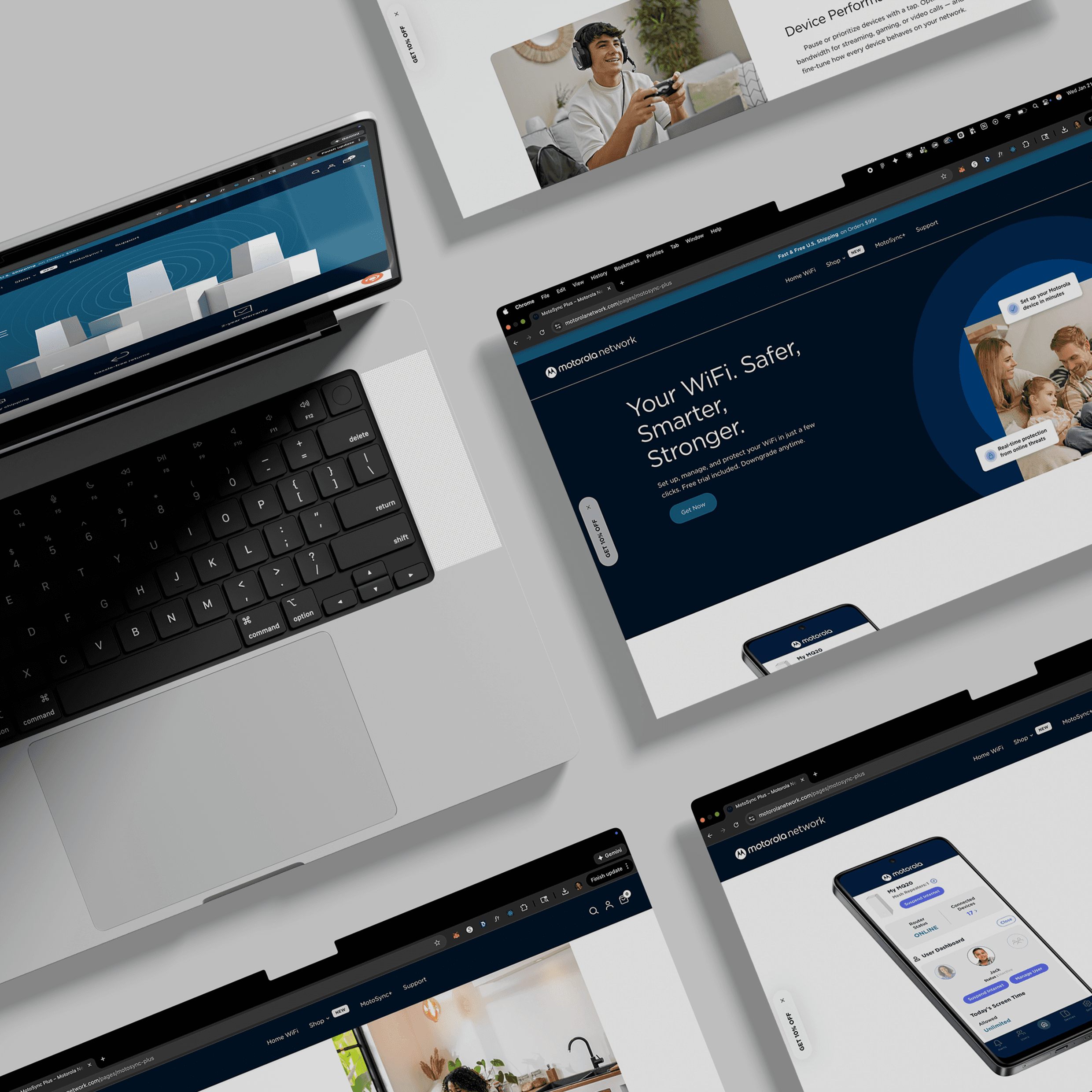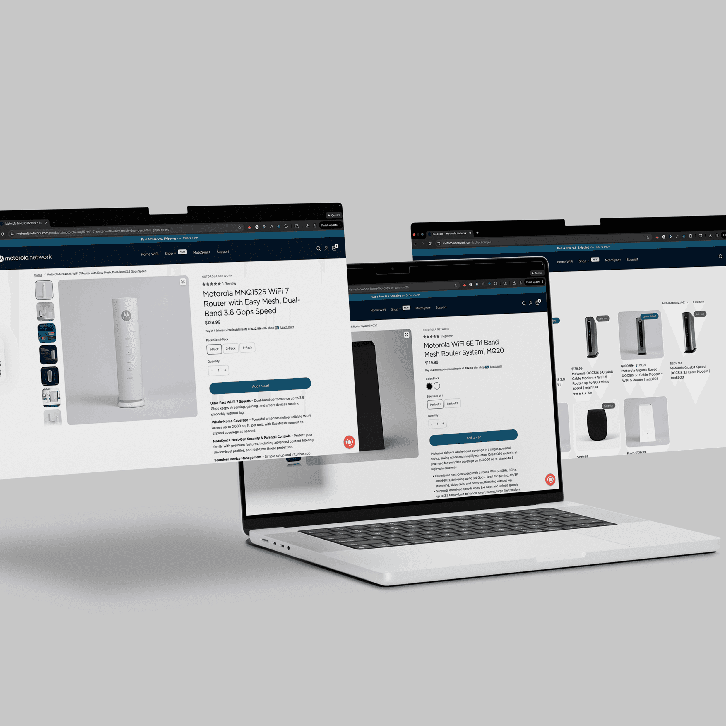 I led the visual and UX design for the Motorola Network ecommerce site, a brand-forward online destination promoting Motorola’s home Wi-Fi products, including routers, modems, and network systems. The site showcases next-gen connectivity hardware with clear, intuitive navigation and product presentation, helping users quickly understand key features and make confident purchase decisions.